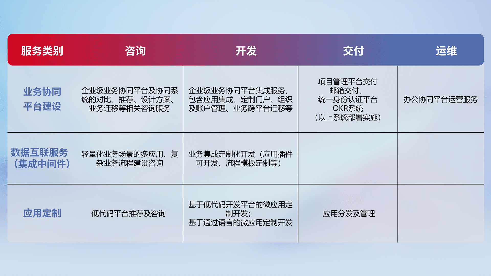 针对钉钉、、、、企微、、、IDaas等平台级产品提供产品的规划、、方案、、、交付、、、定制化开发等服务,,,实现如统一协同办公、、智能客户服务、、、混合会议管理、、、智能数据查询、、、等业务场景,,实现数字化转型。。